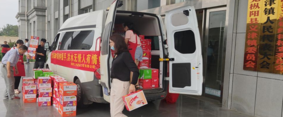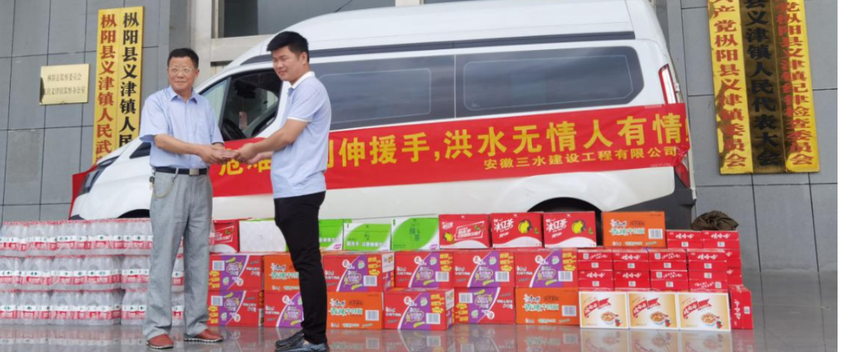 2020年7月21日上午,一輛載有救援物資車輛的愛心物資到達樅陽縣義津鎮(zhèn),車上裝載著安徽三水建設(shè)工程有限公司為一線防汛人員捐贈的方便面、礦泉水等食品價值2萬元的救災(zāi)物資以及現(xiàn)金捐助3萬元。